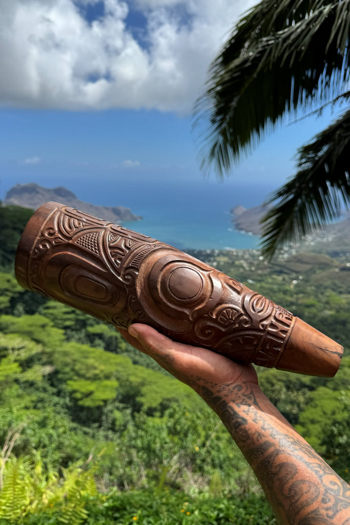 This traditional PU was carved by hand from Oceanic rosewood - adorned with the eyes of a Tiki and traditional Marquesan symbols for protection. It delivers a powerful sound. This PU isn’t just a piece of art, it’s a voice from the Marquesas that was once used to send signals echoing through the valleys.