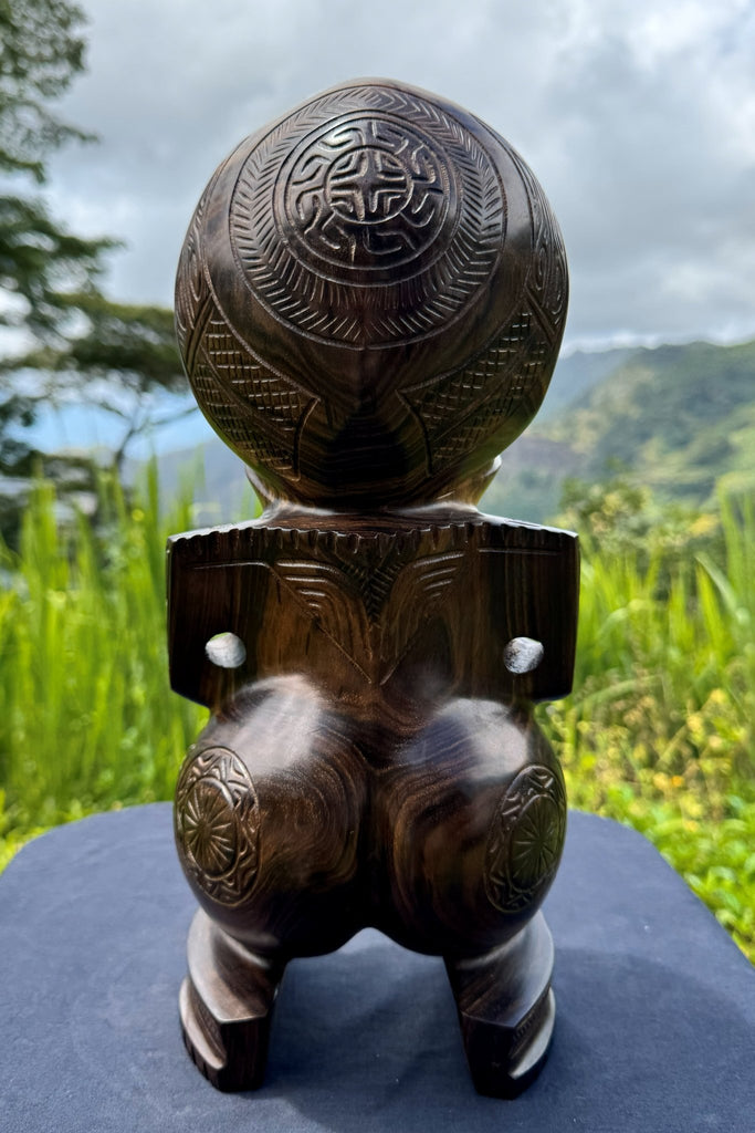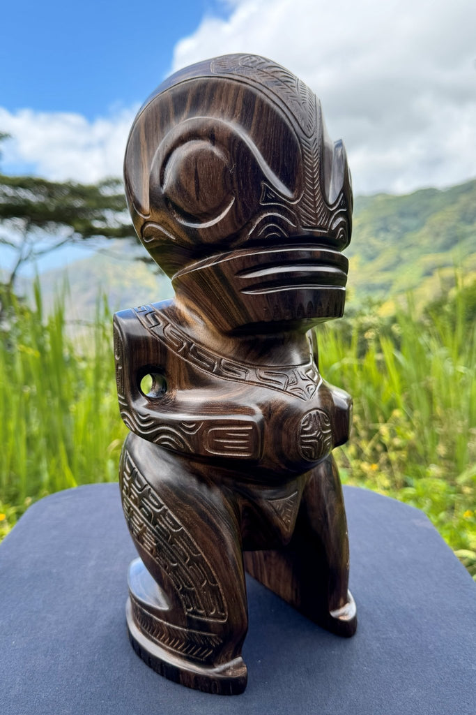 Tiki Tumu is a 35 cm Marquesan tiki hand-carved from exceptional dark-toned oceanic walnut. The carving is fully done by hand and highlights both the quality of the wood and the skill behind it. Simple, elegant, and powerful, this is a tiki made for collectors who appreciate authentic Marquesan craftsmanship and lasting quality.