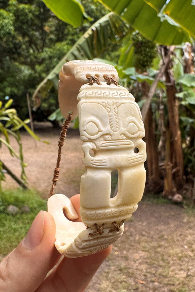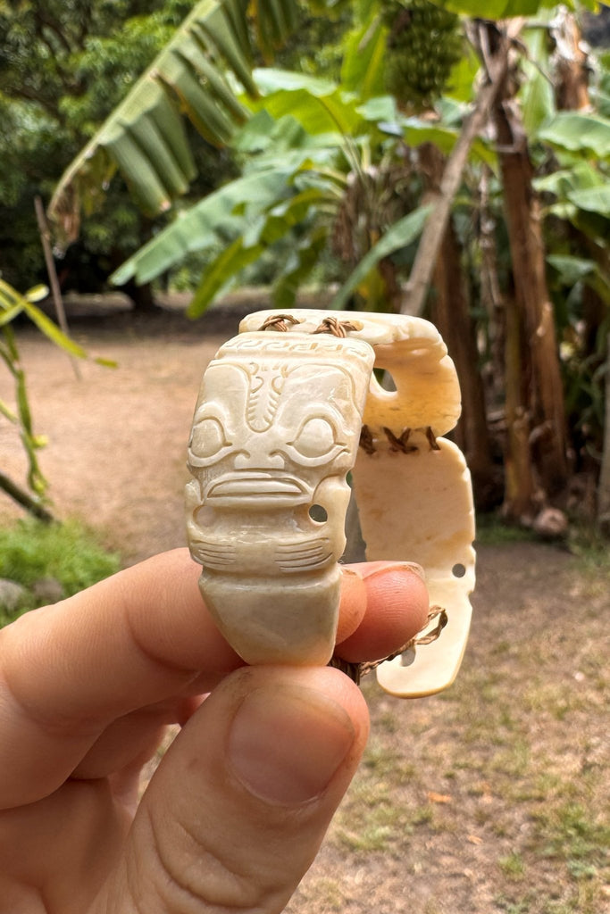 This beautiful Tiki bracelet is hand-carved from cattle bone and tied with durable coconut fiber, all crafted on Nuku Hiva Island. It features three identical tikis, each representing the etua - deified ancestors believed to offer spiritual protection and strength in Marquesan culture. The subtle variations in color and texture are a natural characteristic of bone and make each bracelet unique.