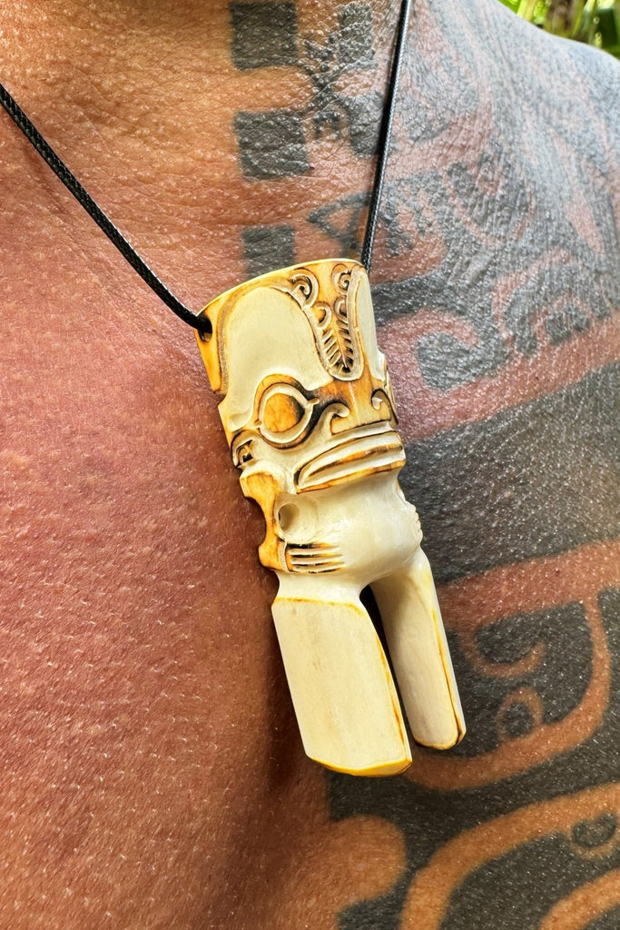Tiki necklace, hand-carved from cow bone. This piece features a naturally warm, yellowish bone tone. A Marquesan tiki symbolizes spiritual guardianship, lineage, and the bond between the community and its ancestors.