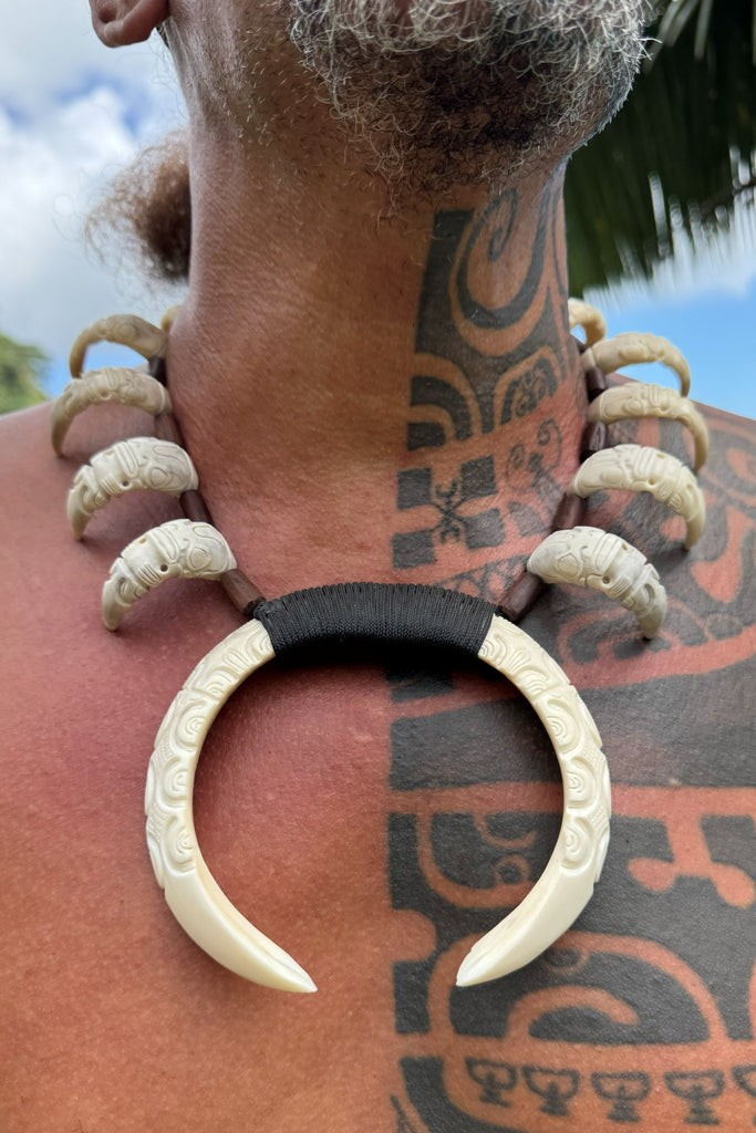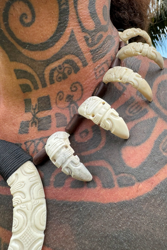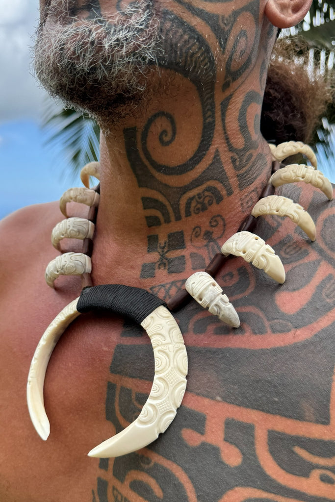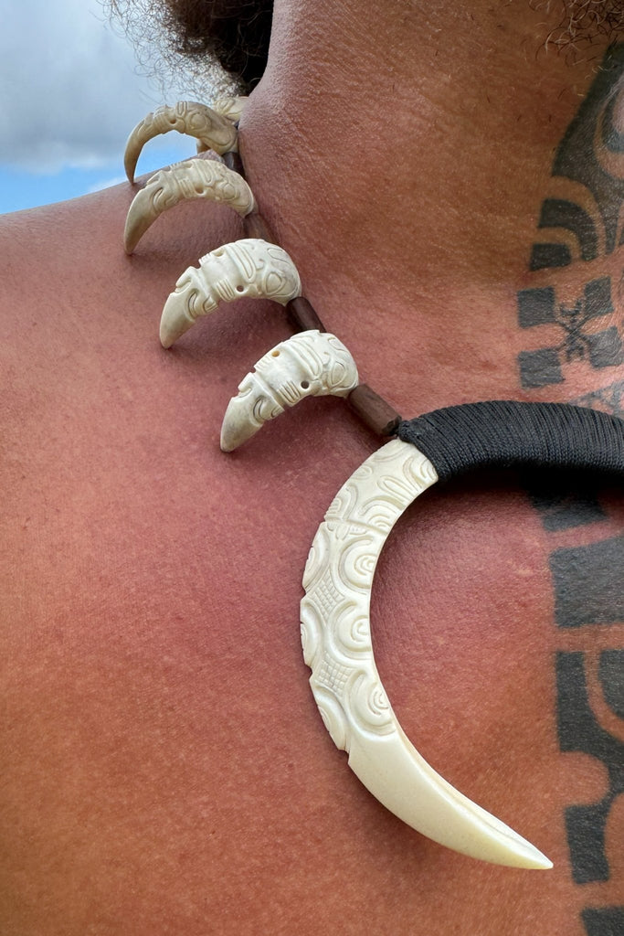 Hunter's Necklace is a symbol of strength and protection. Crafted from wild boar tusks, cattle bones and oceanic rosewood pieces. Adorned with tikis.