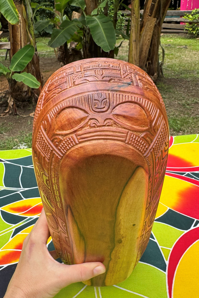 Each ancestral motif is carved by hand and tells its own story of protection, lineage, and connection to the land and ocean. On both sides of the bowl, the eyes of a tiki are carved as guardians, watching over the space and offering symbolic protection to its owner.